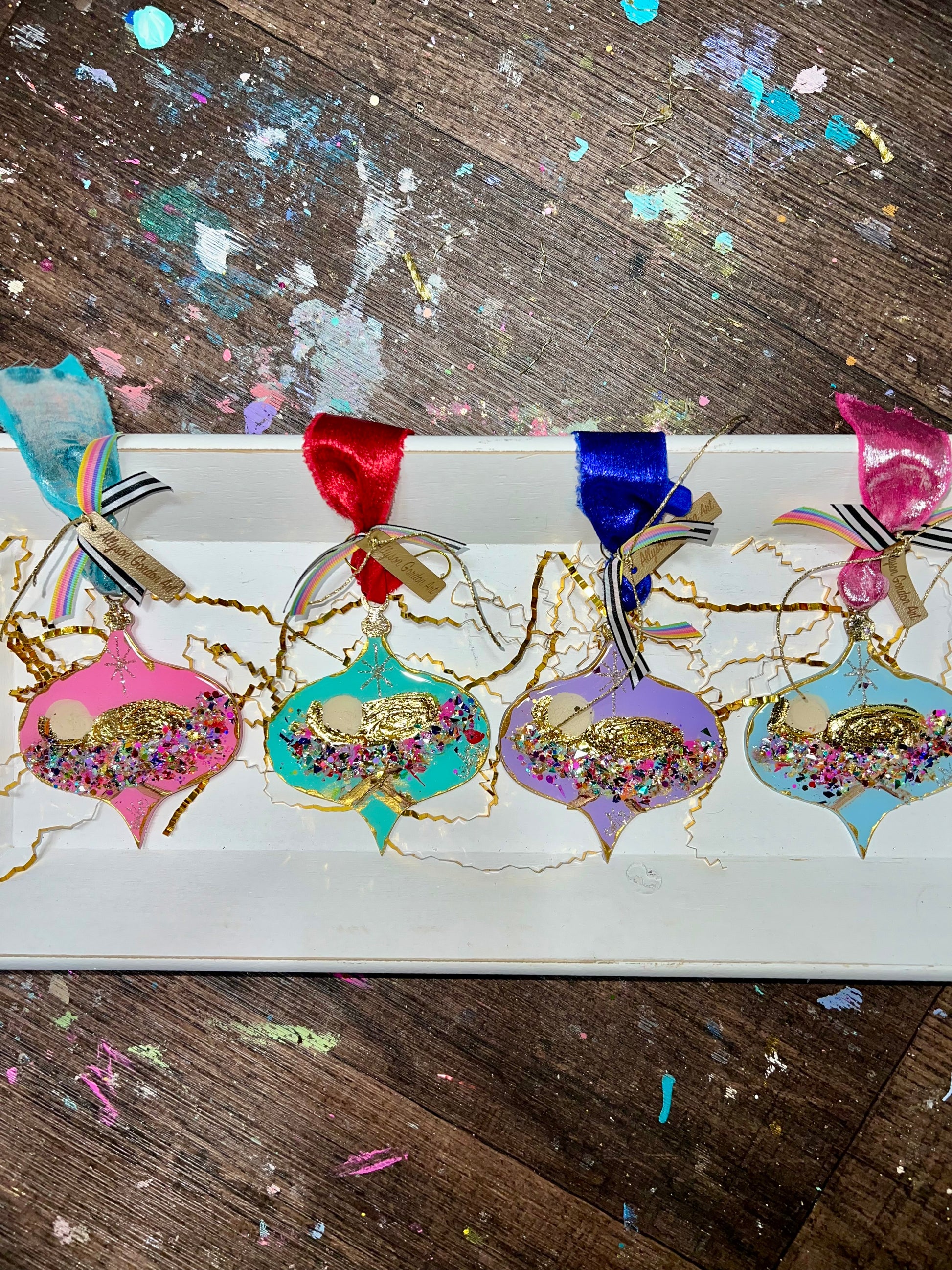 Hand painted ornament measuring approx 7” from top of bow to bottom of ornament. Leave color preference in the notes section at checkout.